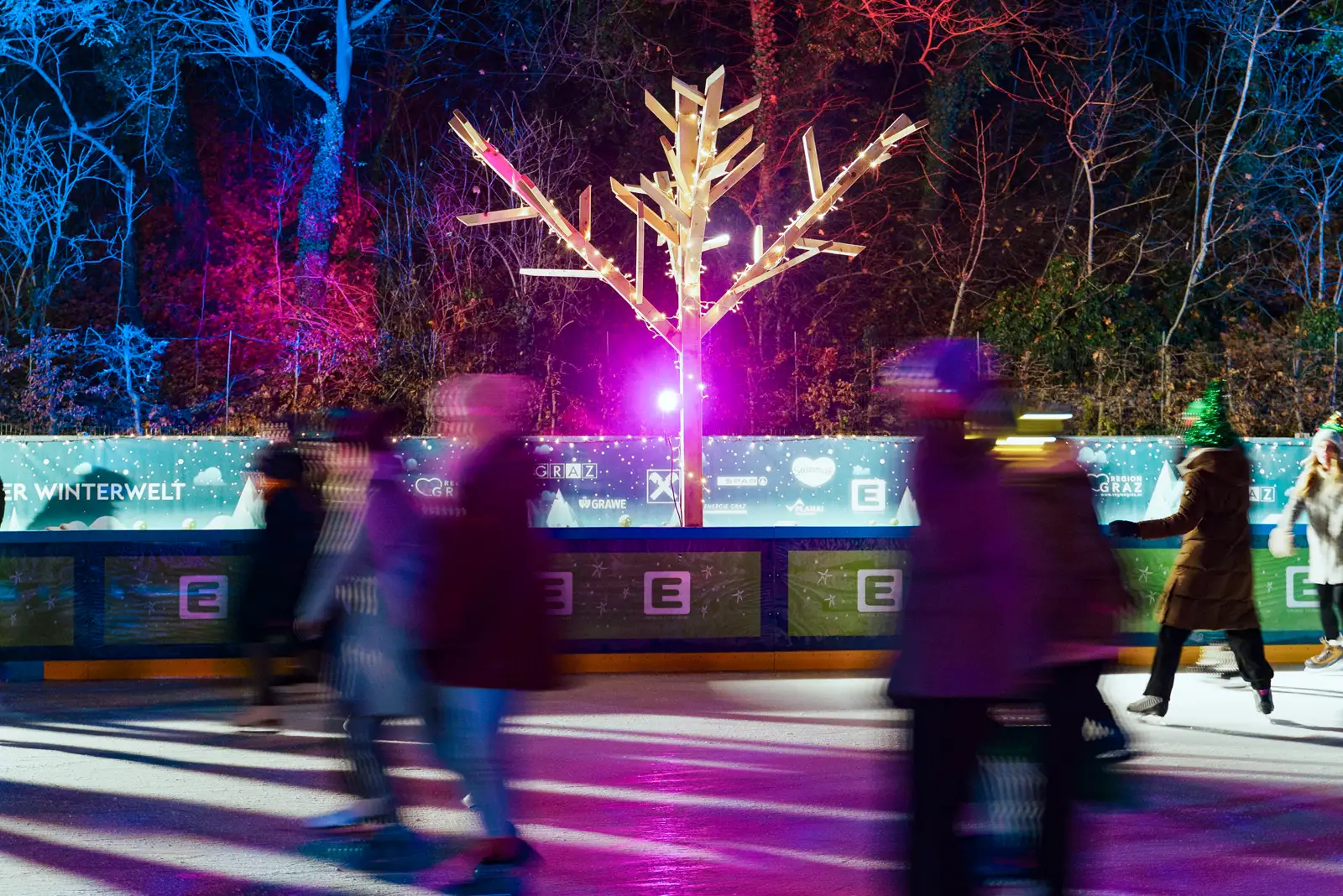 Wrap up warm and hit the ice – no, the dance floor! The combination of smooth ice, colourful lights and rousing beats creates a unique atmosphere, that casts a spell over everyone. Whether alone or with friends at the ice disco at the foot of the Schlossberg in Graz, everyone can dancer on the icy parquet floor.